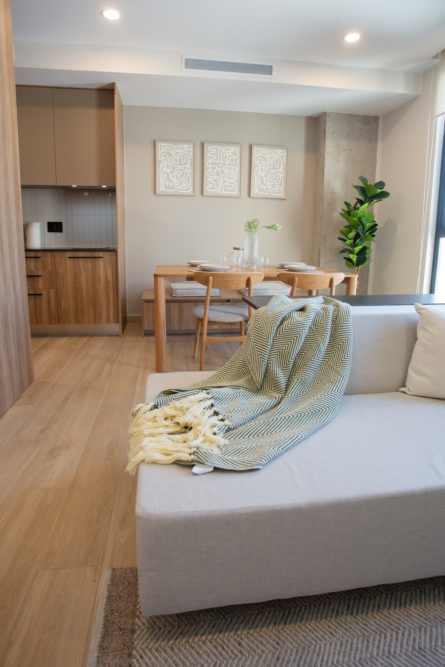 1BR with 1BA, cute and comfortable living room with dining table and small kitchen.