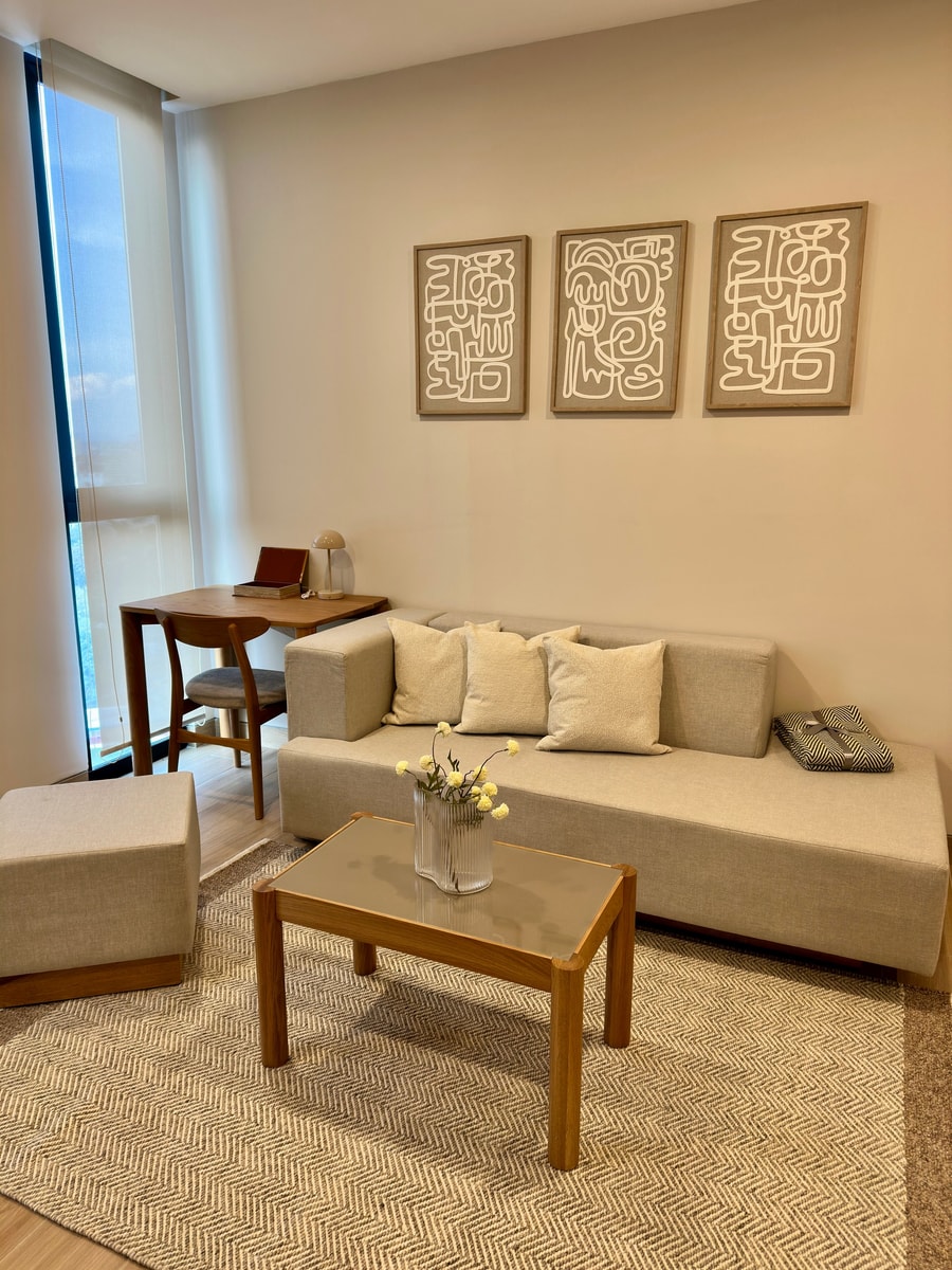 1BR 1BA, cute and comfortable living room with dining table and small kitchen.