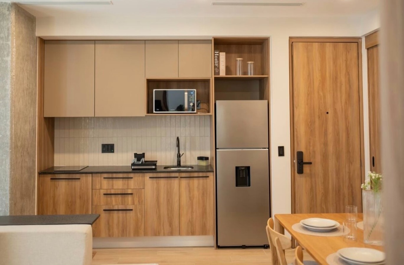 2BR with 2BA, cute and comfortable living room with dining table and small kitchen.