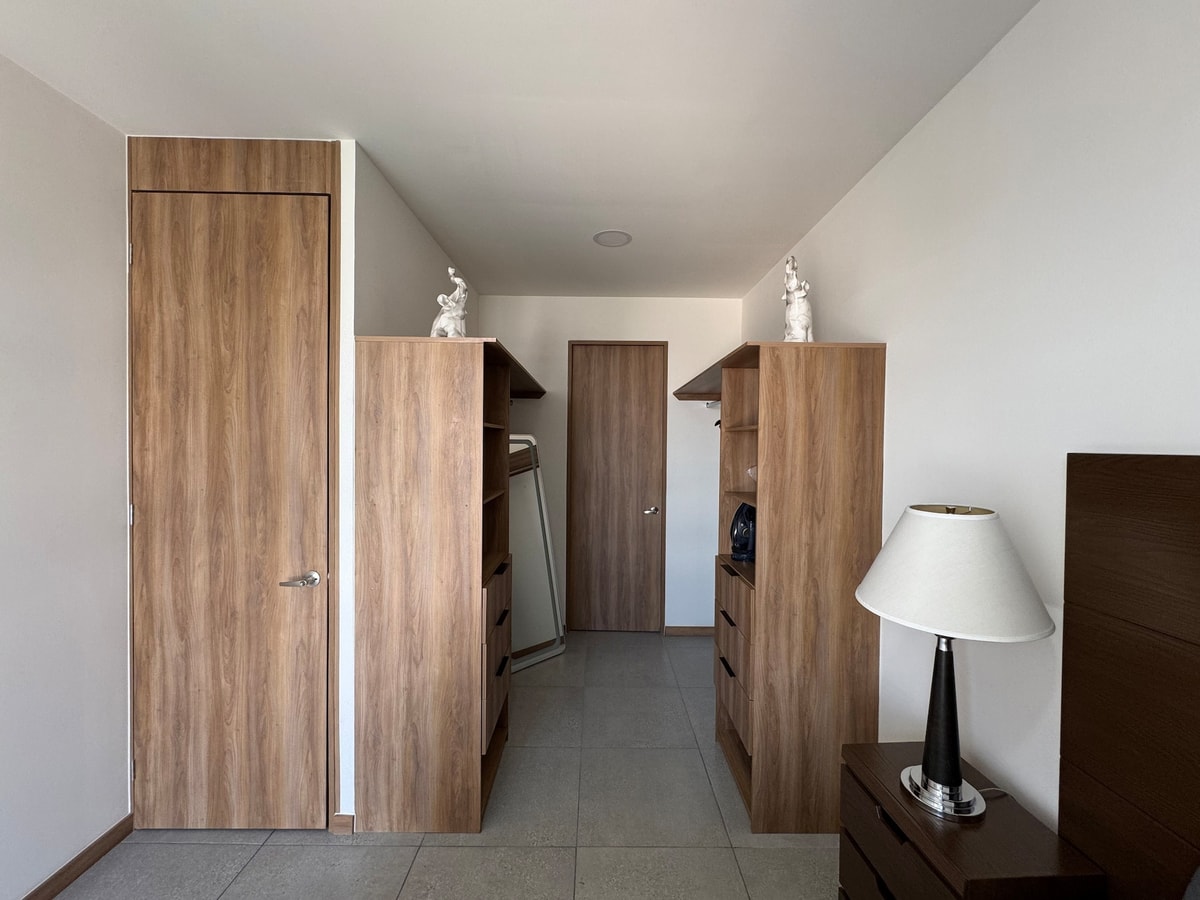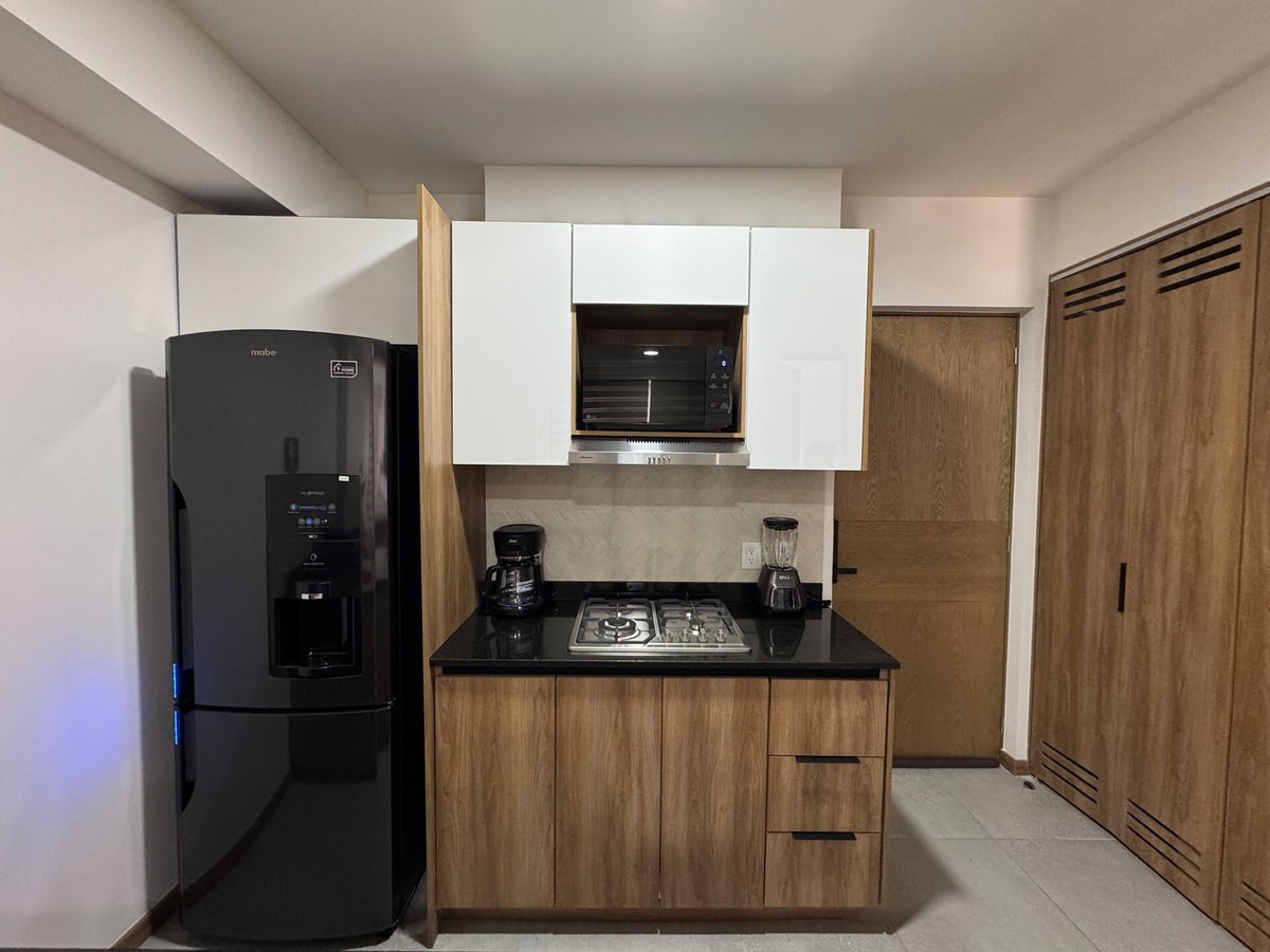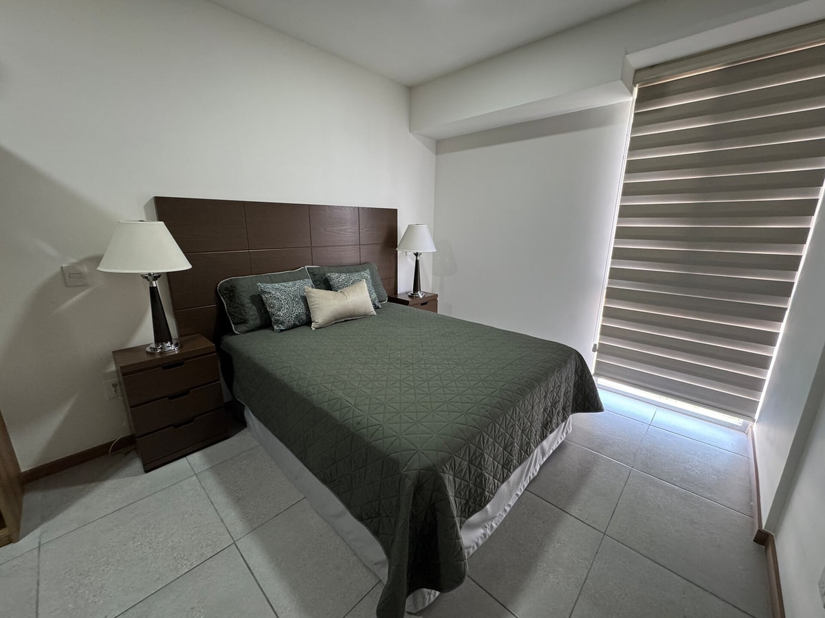 Este departamento de una habitación destaca por su diseño minimalista y una iluminación natural que llena cada espacio, creando una atmósfera de paz y orden desde que entras. El corazón de tu estancia será, sin duda, la espectacular cama tamaño King Size; está pensada para quienes no comprometen su descanso y buscan la máxima amplitud para dormir profundamente.